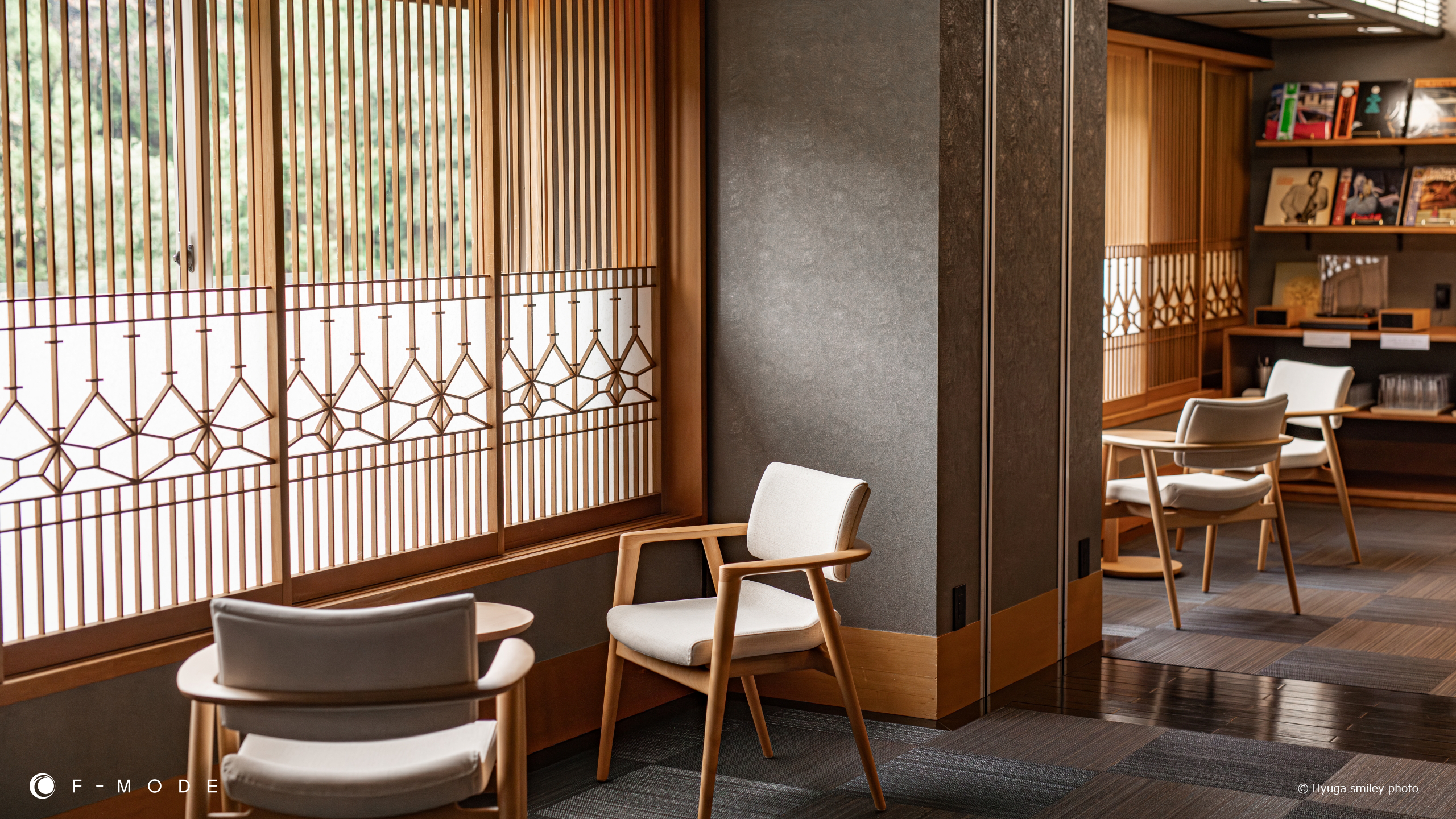 特別客室にご宿泊のお客様だけが利用できるラウンジは、既存意匠に寄り添う落ち着いたダークトーンで整え、 心地よいレコードの音色とともにドリンクをたのしむ大人のリビング 窓際の障子は上部を あえて素通しにすることで、外からの視線をほどよく遮りながら景色を楽しめる明るく開放的な空間に